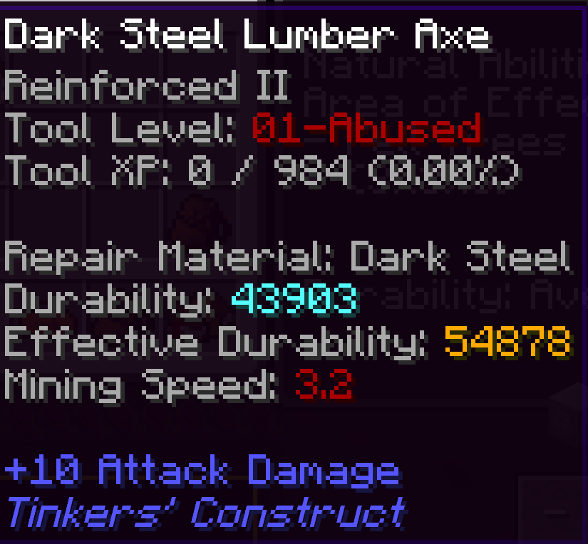 곡괭이는 채굴레벨 때문에 코발트를, 검은 대미지 때문에 바나듐강을, 벌목도끼는 내구도 때문에 Dark Steel을 선택했습니다